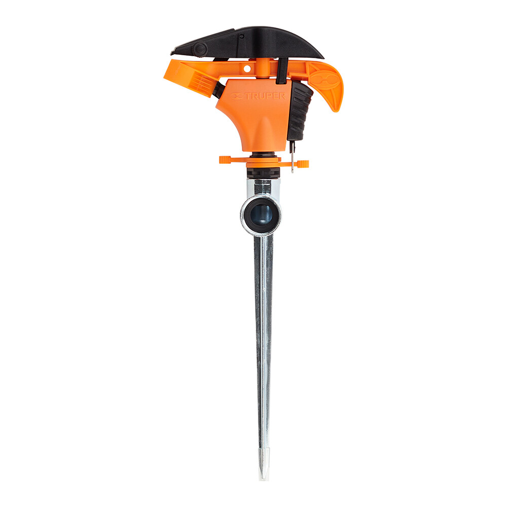 Распылитель водяной импульсный пластиковый, рабочее давление 2,8-3,5 атм. Латунное сопло и латунный коннектор 1/2 дюйма для соединения с опорным стержнем не подвержены коррозии. Металлический четырехгранный опорный стержень с адаптером для подключения к источнику воды 3/4 дюйма. Плавная регулировка сектора полива от 0° до 360° и длины струи от 0 до 21 м. Диаметр полива 17 м. Площадь полива 227 м².