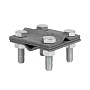 Предназначен для параллельного или перпендикулярного соединения токоотвода диаметром 6–10 мм. Представляет собой 3 пластины размером 57х57 мм, стянутые 4 шестигранными болтами с гайками, имеющими диаметр отверстия 9 мм. Каждая сторона зажима адаптирована под круглый проводник. Между пластинами есть разделительная перегородка, которая необходима для предотвращения очага биметаллической коррозии во время контакта разнородных металлов. В целях надежной работы системы заземления и обеспечения минимального переходного электрического сопротивления контакта все зажимы после монтажа необходимо обмотать изоляционной лентой. Она надежно герметизирует зажим от попадания влаги и предотвращает возникновение коррозии в месте соединения прутка и полосы. Соединитель используется совместно с другими элементами для организации единой системы заземления частных домов, административных зданий и подвальных помещений.