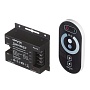 Предназначен для управления монохромной светодиодной лентой. С помощью него можно включать или выключать светодиодную ленту, отрегулировать ее яркость, а также использовать различные динамические режимы и отрегулировать скорость их работы. Одно из преимуществ изделия заключается в возможности работать как от напряжения 12 В, так и 24 В, а значит его можно использовать со светодиодными лентами с соответствующим напряжением. Важно отметить, что в зависимости от того, с каким напряжением предстоит работать устройству, будет отличаться и максимальная мощность нагрузки, которую можно подключить к нему. Так, при напряжении 12 В максимальная нагрузка будет равна 288 Вт, а при напряжении 24 В уже 576 Вт. Это значит, что к данному изделию вы можете подключить в два раза больше светодиодной ленты 24 В. Контроллер укомплектован дистанционным пультом управления, передающим сигнал по радиоканалу, благодаря чему сам контроллер можно спрятать из зоны видимости, и он будет также качественно принимать сигнал от пульта и управлять светодиодной лентой. Управление происходит с помощью стильной сенсорной панели, расположенной на лицевой стороне пульта, который работает от 3-х батареек ААА. Накладной корпус контроллера, выполненный из металла, имеет размер 83х79х33 мм. Степень защиты от пыли и влаги соответствует стандарту IP33, что подразумевает установку устройства в сухом, проветриваемом помещении.