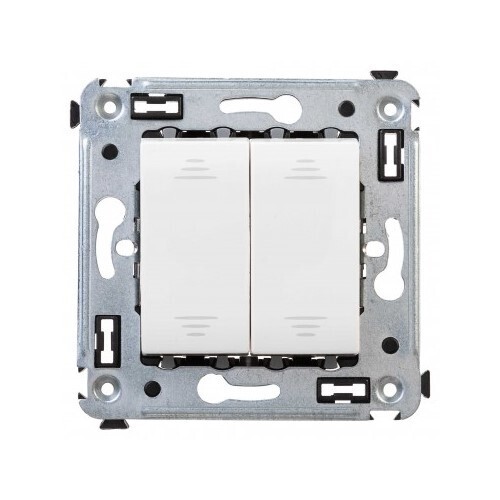 Задача двухклавишного переключателя – управление двумя контурами освещения из двух точек. Он позволяет включить или выключить освещение двумя светильниками из удобной точки – например, в спальне переключатель может размещаться возле кровати. Переключатель предназначен для скрытого монтажа в стену.
