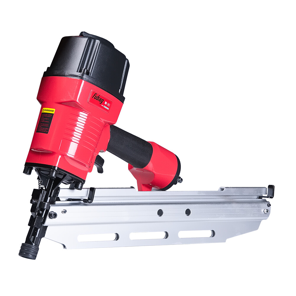 Гвоздезабивной пистолет Fubag N90 с магазином, расположенным под углом к обрабатываемой поверхности. Незаменим для работ в местах, где крепёж вбивают под углом – стяжка полов, конструкции, где образован угол и обычным пистолетом сложно производить работы.