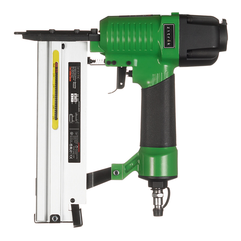 Степлер пневматический для скоб и гвоздей Zitrek ZKPSN01 применяется в производстве и ремонте мебели, настилке полов и т.д. В качестве оснастки используются как скобы, так и гвозди. Модель работает на сжатом воздухе, что значительно продлевает его время работы без остановки и снижает пожаро – и взрывоопасность рабочего процесса. Рукоятка пневмостеплера оснащена прорезиненной накладкой для более надежного хвата. Тип гвоздей – SK50/300/049/F/47/J/055 Тип скоб – 4/55/90/18GA