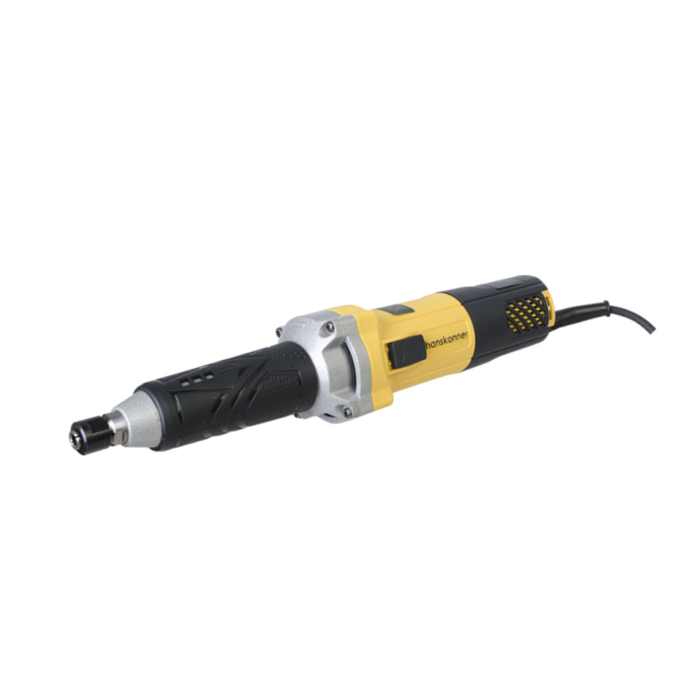 Прямая шлифовальная машина Hanskonner HGD0665 – маневренное универсальное устройство для широкого спектра работ – резка, сверление, полирование, гравирование, шлифование, фрезерование различных материалов – металл, дерево, камень, стекло, пластмасса и т.д. Данная модель оснащена настройкой оборотов VariableGrades с 6 позициями выбора скорости от 10000 до 30000 об/мин. Бронированный ротор продлевает срок службы инструмента. Для подкрепления универсальности есть возможность установки цанг диаметров 6 и 8 мм, что позволяет применять распространенные насадки. Хорошая эргономика корпуса обеспечивается противоскользящими накладками. Морозостойкий резиновый сетевой кабель длиной 4 метра позволяет охватит рабочую зону площадью 50 м².