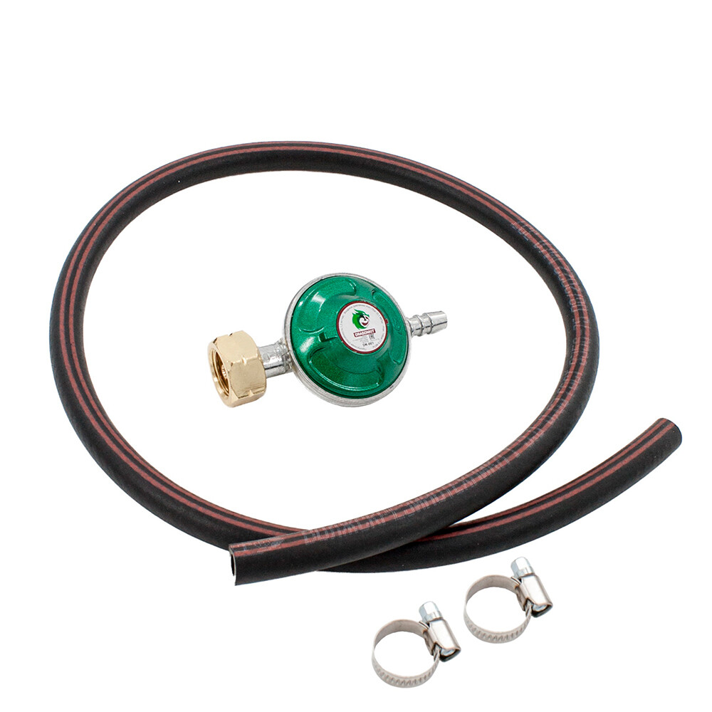 Регулятор – 1 шт., газовый рукав 1 м – 1 шт., хомут червячный – 2 шт., инструкция к регулятору – 1 шт.