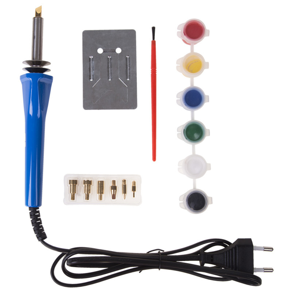Паяльник, жало для пайки, выжигательные насадки – 6 шт., краски – 6 шт., металлическая подставка и кисточка.