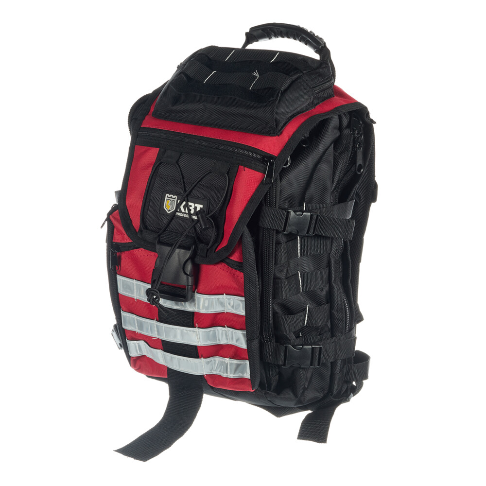 Предназначен для хранения и транспортировки инструмента. Имеет широкие мягкие регулирующиеся лямки, регулируемый поясной ремень и ручка для переноски, защелки-фиксаторы для изменения объема рюкзака, светоотражающие элементы на внешнем фронтальном кармане рюкзака, мягкие анатомические вставки на спинке рюкзака, прочные усиленные молнии с крупными звеньями. Рюкзак выдерживает вес до 10 кг. Конструкция – переднее и заднее внутренние отделения с отдельными молниями; переднее отделение с 10 карманами; заднее отделение с большим широким плоским карманом, 2 карманами из капроновой сетки и вшитым нейлоновым карманом на молнии с 3 крепежными элементами из резиновой ленты и 2 кармашками на липучках. 2 внешних фронтальных каскадных кармана на молнии, 15 крепежных элементов из светоотражающей ленты и 15 крепежных элементов из капроновой ленты на фронтальной части рюкзака. Верхний клапан рюкзака оборудован 2 карманами на молнии и 6 крепежными элементами из капроновой ленты. В одном из карманов на клапане рюкзака вшит внутренний нейлоновый карман и 3 крепежных элемента из резиновой ленты.