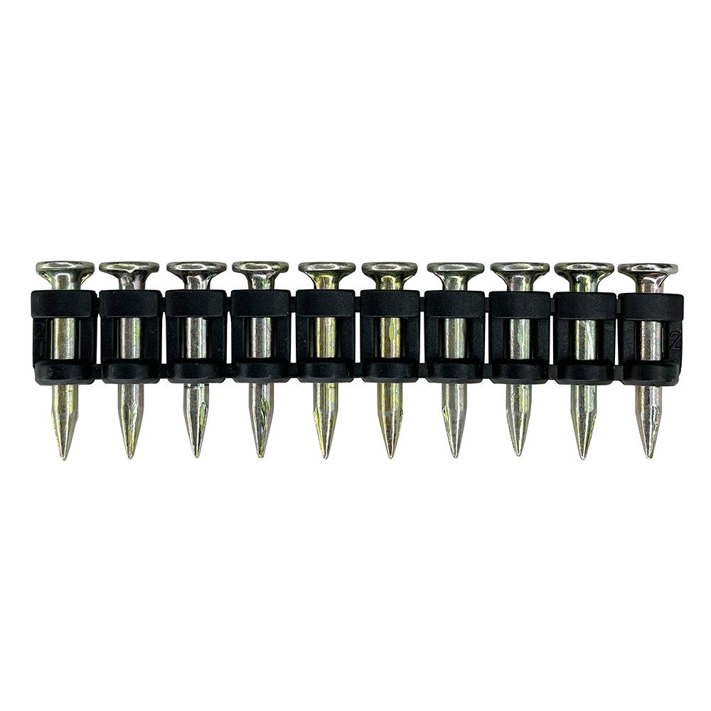 Стандартный гвоздь Toua CN по бетону металлу и кирпичу. Данные гвозди имеют диаметр тела 2,7 мм и резаный конец (остриё производится путём штамповки с отсечением лишнего материала). Гвозди данной толщины создают минимальное расширяющее воздействие на базовый материал при вхождении в него. При этом тонкое тело гвоздя более склонно к изгибающим нагрузкам и при попадании в твердую фракцию с большей вероятностью гвозди могут загнуться и произвести скол. Однако, при вхождении в более однородные материалы – такие как кирпич, пескоцементные блоки, шлакобетон и прочее, данные гвозди создают наименьшее напряжение как в базовом материале, уменьшая возможность растрескивания и раскалывания, особенно при работе близко к краю поверхности, так и в закрепляемом материале при работе без монтажных отверстий. Такие гвозди рекомендуются для монтажа к кирпичной кладке, оштукатуренному кирпичу, к поверхностям из легкого бетона, полнотелым и пустотелым цементным блокам и шлакоблокам, а также к немассивному стальному основанию толщиной до 4-5 мм.