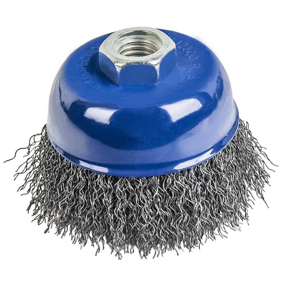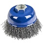 Чашеобразная кордщетка для угловых шлифмашин до 12500 об/мин. Резьбовая посадка на шпиндель. Гофрированная стальная проволока. Для обработки дерева, снятия краски, шлифовки металла, снятия ржавчины, обработки сварных швов.