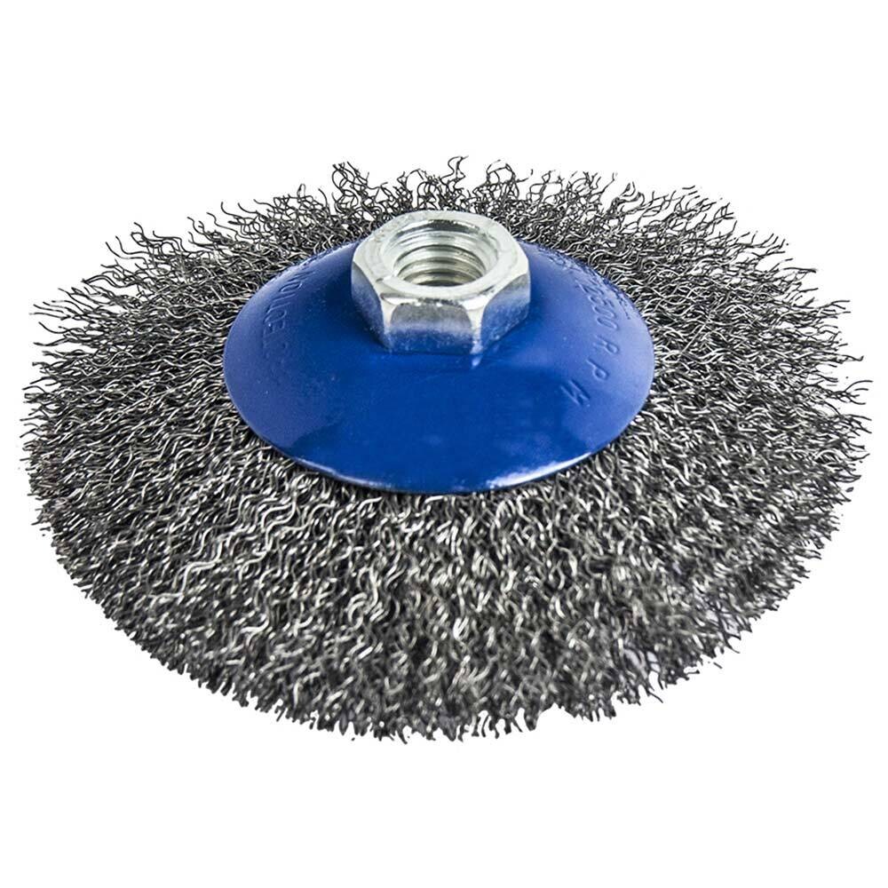 Кордщетка для угловых шлифмашин. Резьбовая посадка на шпиндель. Гофрированная стальная проволока. Для обработки деревянных и металлических поверхностей в труднодоступных местах, снятия краски, ржавчины, обработки сварных швов.