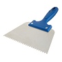 Шпатель представляет собой инструмент с треугольными зубьями, где ширина зубца – 3,4 мм, а высота – 3,6 мм. Угол надреза составляет 55°. Предназначен для проведения работ по укладке паркета, ламината в качестве инструмента для нанесения клеевого раствора.
