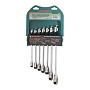 Применяется при обслуживании крепежа при свободном вращении. В сочетании с адаптерами используются в качестве трещоточных рукояток для различных насадок. Гаечный комбинированный ключ представляет собой конструкцию, объединяющую рожковый профиль и накидной профиль с рабочей частью со встроенным храповым механизмом. Сочетание двух одноразмерных профилей компенсируют недостатки каждого в отдельности. Храповой механизм с колесом в 72 зуба обеспечивает высокий передаваемый крутящий момент благодаря применяемой хромованадиевой стали, закаленной особым способом. Малый, 5°, обратный ход делает ключ незаменимым в ограниченном рабочем пространстве. Ключи изготовлены по стандарту ANSI, имеют трехслойное хромоникелевое покрытие, зеркально отполированы. Набор состоит из 7 предметов.