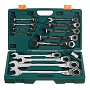 Применяется при обслуживании крепежа при свободном вращении. В сочетании с адаптерами используются в качестве трещоточных рукояток для различных насадок. Гаечный комбинированный ключ представляет собой конструкцию, объединяющую рожковый профиль и накидной профиль с рабочей частью со встроенным храповым механизмом. Сочетание двух одноразмерных профилей компенсируют недостатки каждого в отдельности. Храповой механизм с колесом в 72 зуба обеспечивает высокий передаваемый крутящий момент благодаря применяемой хромованадиевой стали, закаленной особым способом. Малый, 5° обратный ход делает ключ незаменимым в ограниченном рабочем пространстве. Ключ изготовлен по стандарту ANSI, имеет трехслойное хромоникелевое покрытие, зеркально отполирован. Применяется при обслуживании крепежа при свободном вращении. В сочетании с адаптерами используются в качестве трещоточных рукояток для различных насадок. Набор состоит из 17 предметов. – Пластиковый кейс.