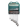 Применяется при обслуживании крепежа при свободном вращении. В сочетании с адаптерами используются в качестве трещоточных рукояток для различных насадок. Гаечный комбинированный ключ представляет собой конструкцию, объединяющую рожковый профиль и накидной профиль с рабочей частью со встроенным храповым механизмом. Сочетание двух одноразмерных профилей компенсируют недостатки каждого в отдельности. Храповой механизм с колесом в 72 зуба обеспечивает высокий передаваемый крутящий момент благодаря применяемой хромованадиевой стали, закаленной особым способом. Малый, 5°, обратный ход делает ключ незаменимым в ограниченном рабочем пространстве. Ключи изготовлены по стандарту ANSI, имеют трехслойное хромоникелевое покрытие, зеркально отполированы. Набор состоит из 8 предметов.