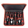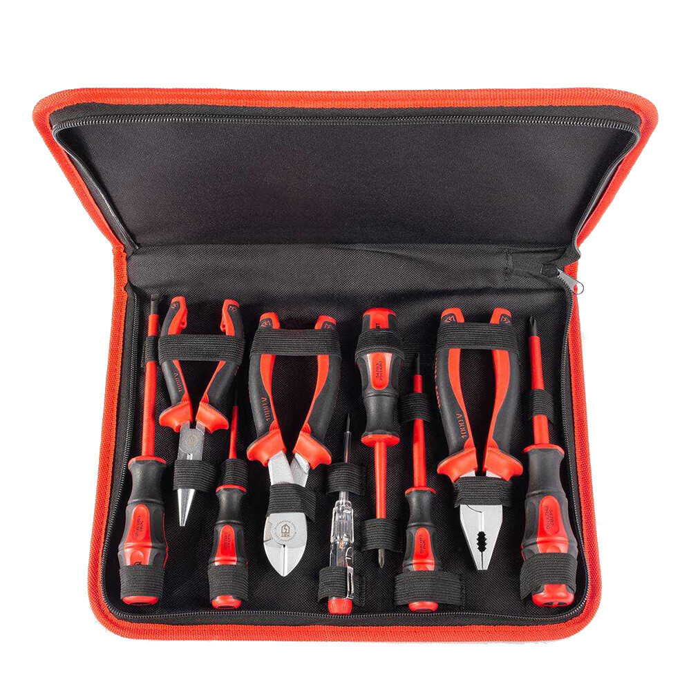 Диэлектрические пассатижи 180 мм, диэлектрические бокорезы усиленные 180 мм, диэлектрические длинногубцы 160 мм, диэлектрическая отвертка: шлиц 3х75, диэлектрическая отвертка: шлиц 4х100, диэлектрическая отвертка: шлиц 5.5х125, диэлектрическая отвертка: PH1x100, диэлектрическая отвертка: PH2x100, отвертка-индикатор, водозащитная сумка-кофр.