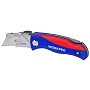 Нож складной + 6 лезвий трапециевидной формы. Прорезиненный упор для большого пальца. Механизм быстрой смены лезвия. Запирающееся лезвие. Лезвия хранятся в рукоятке из легкого и прочного АБС пластика. Зажим для ремня из нержавеющей стали.