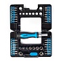 Предназначен для слесарных работ. Отвертка с трехпозиционным реверсивным механизмом. Имеет отделение для 4-х бит в рукоятке отвертки. Биты закреплены в кейсе в открывающихся прозрачных отделениях. Имеется маркировка типов бит на внешней стороне отделений и кейсе.