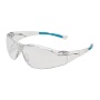 Панорамная прозрачная линза из поликарбоната. Гарантированная боковая защита за счет геометрии очков – дужка по форме продолжает линзу. Мягкий носовой упор из термопластичного эластомера анатомической формы обеспечивает комфорт, не создает давления. Широкие дужки из гибкого поликарбоната с прорезиненными вставками препятствуют соскальзыванию.