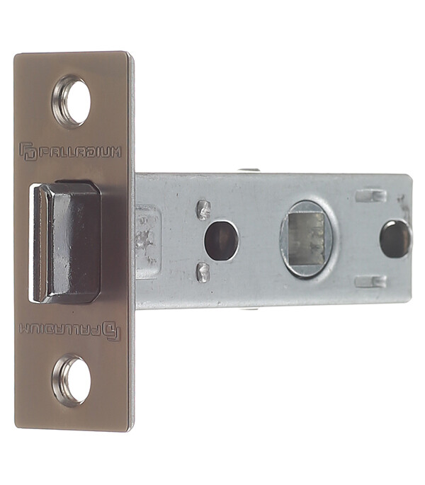 Защелка межкомнатная серии 100. Механизм оснащен металлическим язычком, обеспечивающим максимальный срок службы изделия. Гарантированное количество циклов безотказной работы узлов защелки более 200000. Качество гальванического покрытия подтверждено тестом на устойчивость в камере соляного тумана – более 96 часов.