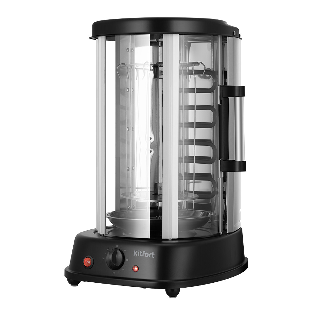 Электрошашлычница КТ-1411 позволит приготовить шашлык из мяса, рыбы или овощей, а также другие блюда на вертеле или шампурах. Инфракрасный нагревательный элемент обеспечивает такой же нагрев, какой дают угли в обычном мангале, а автоматическое вращение шампуров позволяет мясу оставаться сочным внутри и равномерно обжаренным снаружи. Переключатель служит для выбора уровня нагрева или выключения нагрева. Регулятор позволяет установить таймер до 60 минут. Под шампурами расположена специальная тарелочка для сбора сока и жира. После приготовления шашлыка эту тарелочку можно легко снять и вымыть с моющим средством. Вертел с зажимами предназначен для приготовления курицы, мяса, рыбы и других продуктов на вертеле. Также на вертел устанавливаются держатели шампуров. Шампуры используются для приготовления шашлыков.