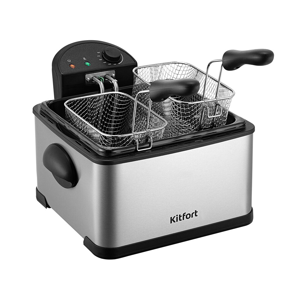 Фритюрница предназначена для приготовления разнообразных блюд в горячем масле. С ней вы сможете жарить овощи, рыбу, мясо в кляре и без него. С помощью регулятора вы легко установите оптимальную температуру нагрева в диапазоне от 115°С до 190°С. А защита от перегрева обеспечит безопасность использования. Термостат автоматически выключит нагрев, если температура превысит допустимое значение. Для вашего удобства фритюрница оснащена смотровым окном. Так можно отслеживать готовность блюда, не открывая крышку. А технология «холодная зона» создает зазор между чашей и нагревательным элементом. В эту зону попадают остатки продуктов, не пригорая. Крышка и чаша фритюрницы съемные, что упрощает чистку и обслуживание. В комплекте три корзины – одна большая и две маленькие. Для удобства хранения их ручки снимаются. А в крышке находятся фильтры, сдерживающие распространение запаха во время готовки. Максимальный объем заполнения чаши маслом – 6 л. Среднее время нагрева масла до 190°С 10-15 минут.