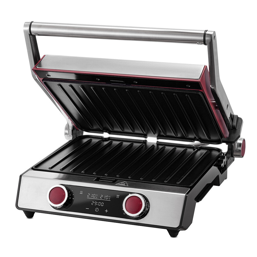 Конструкция гриля позволяет готовить в одностороннем режиме. Крышка гриля откидывается на 180°, благодаря чему гриль превращается в большую жаровню, а продукты можно выложить сразу на две панели.