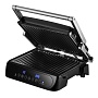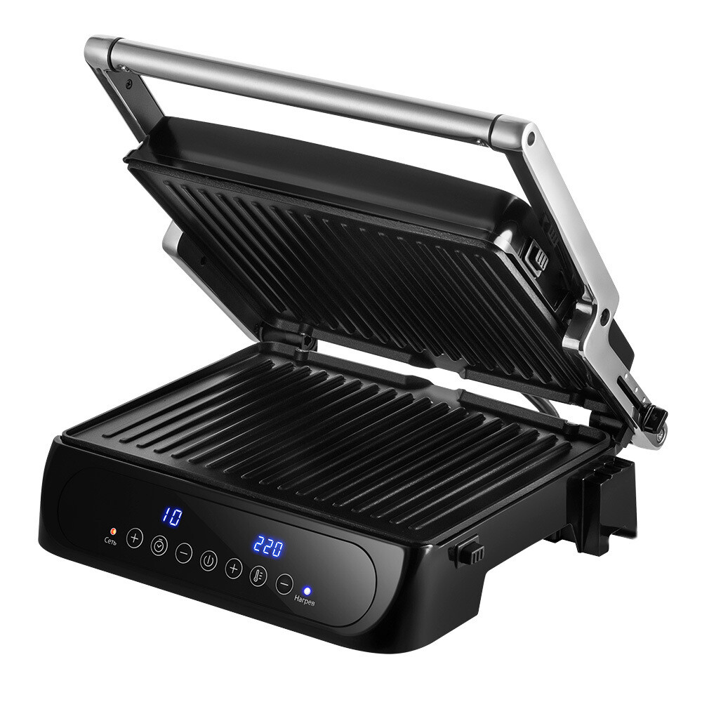 Электрогриль позволяет регулировать время и температуру приготовления, а также гриль оснащен дисплеем и термостатом для поддержания температуры панелей.