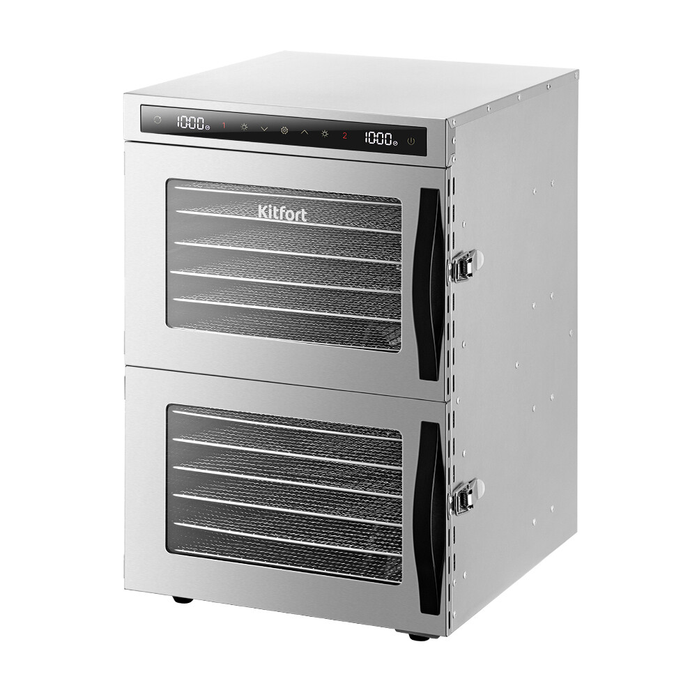 Электрическая сушилка КТ-4937 предназначена для сушки овощей, фруктов, ягод, грибов, корнеплодов, трав и зелени, а также мяса и рыбы, хлеба. Сушилка имеет две независимые камеры, в каждую из которых может быть установлено по 6 металлических поддонов. Устройство оснащено панелью управления, с помощью которой можно настраивать температуру и время, а также включать подсветку. Температуру сушки можно изменить от +30 до +70 °C. Сушилка оснащена таймером до 24 часов работы. В сушилку установлены мощные нагревательные элементы и 2 вентилятора, обеспечивающие равномерное распределение нагретого воздуха по всему объему камеры. Благодаря горизонтальному обдуву смешение запахов при одновременной сушке разных продуктов минимально. Сушилка имеет в комплекте 12 металлических поддонов – для большинства типов продуктов, 12 сеток – для небольших продуктов (травы и ягоды), а также 12 сплошных поддонов – для пастилы и фруктов. Поддон можно класть на дно сушилки для поддержания чистоты. Дверцы оборудованы фиксаторами. Чтобы открыть дверцу сушилки, нужно сначала открыть фиксатор дверцы. Отогните ручку фиксатора дверцы в сторону и снимите петлю фиксатора с крючка. Для закрытия зацепите петлю фиксатора за крючки, прижмите ручку к корпусу. Кнопка «Подсветка» включает и выключает подсветку камеры. Когда подсветка включена, индикатор нажатой кнопки горит красным. В верхней камере находится вращательный механизм с крючками, на которых можно сушить продукты в вертикальном виде.