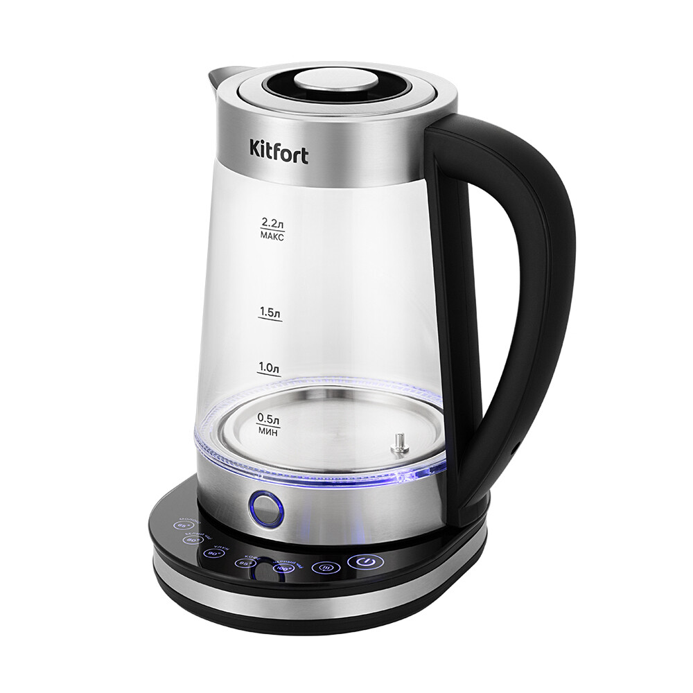Электрический чайник с электронным терморегулятором Kitfort КТ-6764 может не только вскипятить воду, но и нагреть ее до температур: 65, 80, 90, 95 и 100 °С, что очень удобно при заваривании различных сортов чая и приготовления детского питания. На подставке расположена панель управления чайником. Чайник оснащен функцией поддержания температуры. Температура воды контролируется встроенным в дно чайника термодатчиком. Корпус чайника выполнен из стекла и нержавеющей стали, а крышка и подставка – из пластика и нержавеющей стали. Мерная шкала нанесена на прозрачную стеклянную часть корпуса. Съемная крышка и большое горлышко чайника облегчают доступ внутрь при мытье. Нагревательный элемент (ТЭН) у этой модели чайника скрытый, он находится в донной части. Такая конструкция препятствует образованию накипи, облегчает уход и значительно снижает шум при нагревании воды. Полный чайник закипает за 5–10 минут. При закипании чайник автоматически отключается. Прибор имеет защиту от перегрева и от включения без воды: при включении без воды чайник нагревается и отключается (срабатывает защита от перегрева).