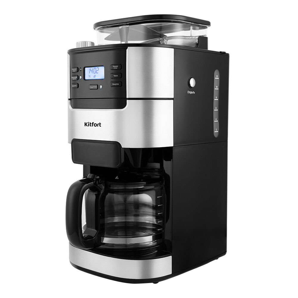 Капельная кофемашина Кіtfort КТ-720 готовит ароматный кофе одним нажатием кнопки. Встроенная кофемолка автоматически измельчит кофейные зерна и засыпет молотый кофе в фильтр, а затем заварит его. Таймер отложенного старта позволяет запрограммировать момент включения кофемашины. С помощью регулятора помола возможно установить степень измельчения кофейных зерен. Резервуар емкостью 1,5 л позволяет за один раз приготовить кофе на 12 чашек. По окончании приготовления кофемашина перейдет в режим подогрева. Подогревная платформа будет горячей в течение 35 минут, затем кофемашина выключится.
