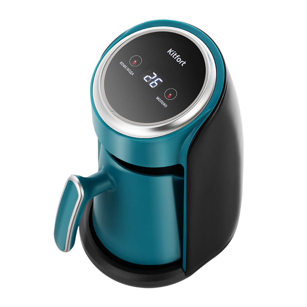 Электрическая турка КТ-7457 варит кофе по-турецки. С ней вы сможете быстро и легко сварить натуральный кофе на 4 чашки по 60 мл. Также с помощью турки вы можете вскипятить воду или подогреть молоко. На дисплее отображается текущая температура воды, кофе или молока в турке. Кнопка «Кофе/Вода» включает нагрев жидкости в турке до 100 °C. Кнопка «Молоко» включает нагрев молока в турке до 60 °C. У турки 2 носика, это сделано специально, чтобы вам было удобно наливать кофе в чашку вне зависимости от того, правша вы или левша. Ручка турки пластиковая, не нагревается и удобно лежит в руке. Турка отключается после закипания кофе. Датчик температуры, встроенный в дно турки, позволяет выключить приготовление кофе не по времени, рассчитанному примерно, а по температуре жидкости внутри турки. Сразу после приготовления кофе или подогрева молока, включается режим поддержания температуры, благодаря чему ваш кофе не остынет, если вы не успели выпить его сразу. Турка выполнена в ярком привлекательном дизайне и обязательно украсит вашу кухню!