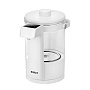 Термопот предназначен для кипячения воды и поддержания температуры с помощью периодического включения и отключения нагрева. У термопота есть 3 режима работы – «Кипячение», «Кофе» и «Молоко», в которых можно настроить температуру поддержания воды от 40 до 95°С с шагом 1 °C, что очень удобно при заваривании различных сортов чая и приготовления детского питания. При подаче воды в кружку загорается подсветка, расположенная на носике. Блокировка кнопки подачи воды не позволит получить ожог при случайном включении подачи воды. Колба выполнена из стекла и имеет мерную шкалу, поэтому следить за количеством воды очень удобно. Съемная крышка и большое горлышко облегчают доступ внутрь при очистке и наполнении термопота. Внутренняя сторона крышки сделана из нержавеющей стали. Термопот имеет защиту от перегрева и от включения без воды.