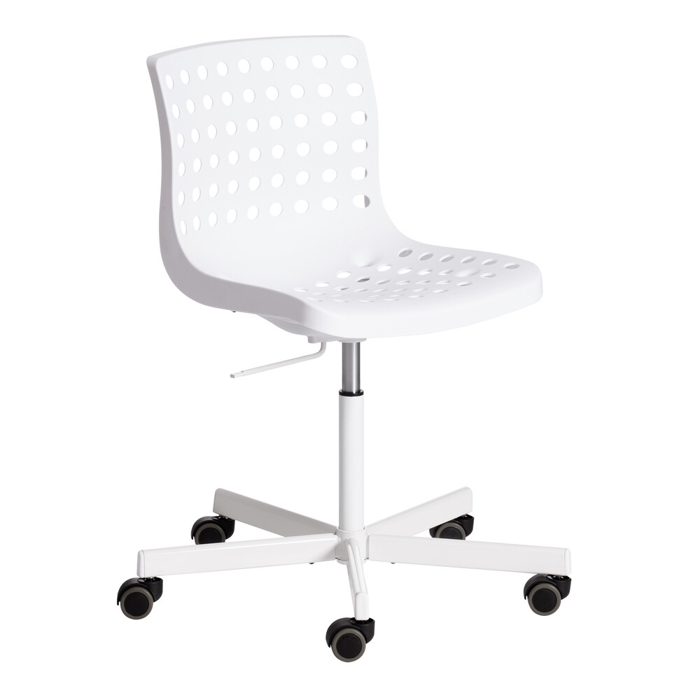 Стильное офисное кресло Skalberg office из коллекции Modern выполнено в стиле узнаваемых моделей современных скандинавских дизайнеров компании IKEA. Кресло отлично впишется в интерьер домашнего кабинета, офиса, детской или спальни. Удобное сиденье и спинка позволят с комфортом расположиться на длительное время. Каркас кресла выполнен из литого прочного пластика белого цвета c перфорацией. Крестовина выполнена из металла и покрашена в цвет каркаса кресла. На колесиках кресла есть прорезиненные вставки, которые предотвращают повреждение любых напольных покрытий. Модель практична, надежна, способна выдерживать большие нагрузки, устойчива к воздействию влаги, температурным перепадам и проста в уходе. Кресло очень просто в сборке, инструкция по сборке прилагается.