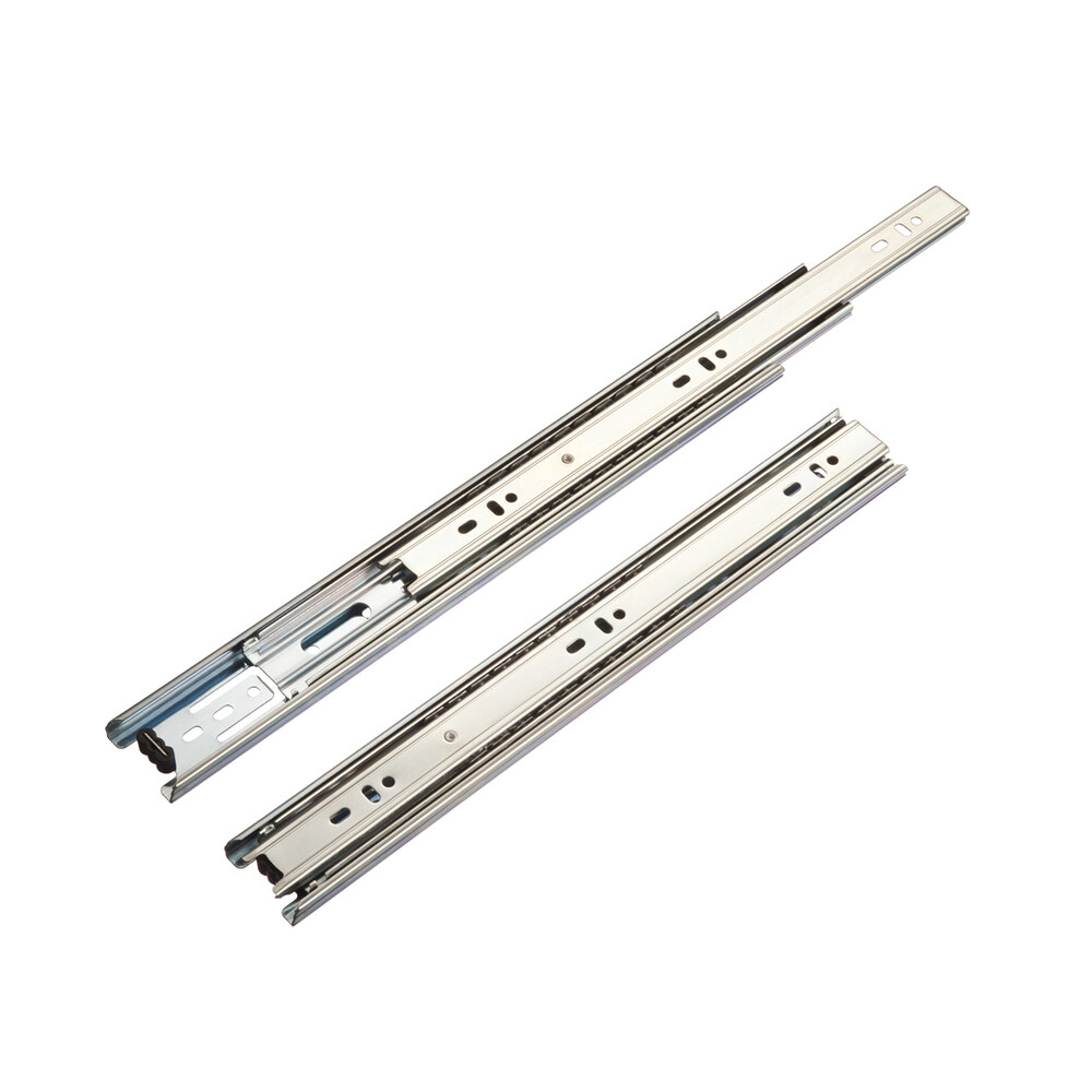 Шариковые направляющие 45 мм полного выдвижения без доводчика. Направляющие полноразмерной высоты обладают увеличенной толщиной металла и, соответственно, высокой грузоподъемностью до 30 кг. Обеспечивают плавный бесшумный ход ящиков на протяжении всего жизненного цикла.