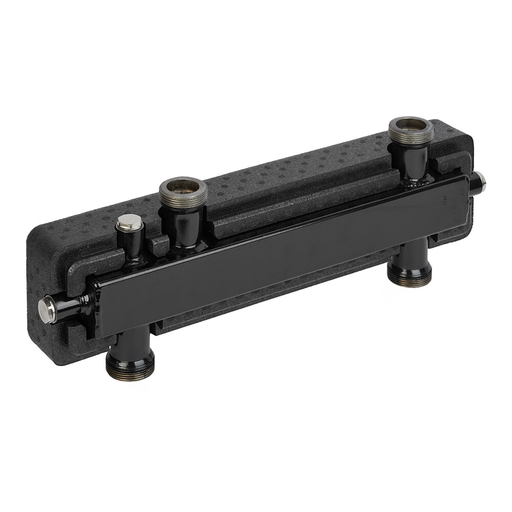 Предназначена для исключения влияния насосов каждого контура друг на друга при различных режимах работы систем. Гидравлический разделитель представляет собой ёмкость с четырьмя патрубками – два с одной стороны для подключения первичного (котлового) циркуляционного контура и два с другой стороны для присоединения вторичных контуров систем теплопотребления. Кроме основных патрубков, гидроразделитель снабжен штуцерами с резьбой G 1/2” для установки воздухоотводчика, дренажного крана и контрольного термометра. Гидравлический разделитель устанавливается между контурами источника тепловой энергии и систем теплопотребления. При этом каждый из контуров должен иметь свой циркуляционный насос. Выбор гидравлического разделителя осуществляется по предельно-допустимому расходу теплоносителя через него. Насос первичного контура выбирается на суммарный расход теплоносителя в системе и потери давления в первичном контуре (без учета потерь давления в системах теплопотребления). При выборе насосов вторичных контуров, потери напора в первичном контуре не учитываются. В качестве теплоносителя может использоваться вода или гликоль до 30%.