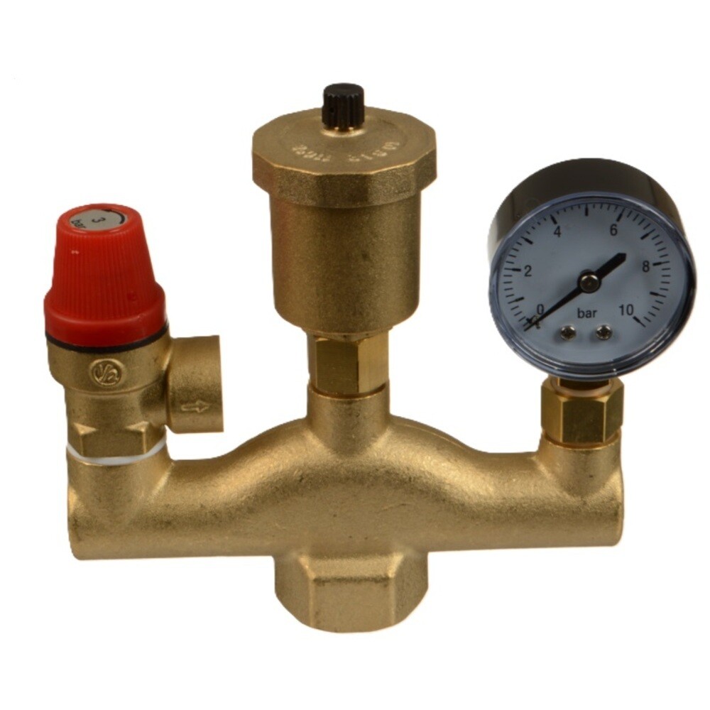 Предназначена для защиты системы отопления от превышения максимально допустимого рабочего давления. Выполнена из латуни. Представляет собой набор предохранительных элементов, размещенных на отдельном коллекторе, подключенном к системе отопления с помощью резьбовой муфты. В состав группы безопасности входят предохранительный клапан с фиксированной настройкой на 3 бар., автоматический воздухоотводчик и манометр.