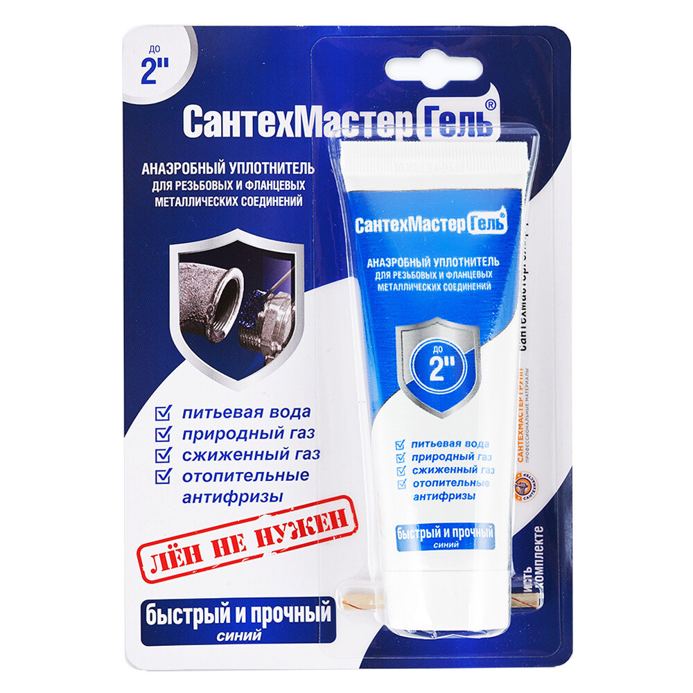 СантехМастер Гель синий – это анаэробный герметик для металлических резьб со стандартным (средним) зазором и металлических фланцев. Основными достоинствами этого анаэробного герметика являются быстрота полимеризации, легкость в использовании и простота последующего демонтажа соединения. Обеспечивает надежную герметизацию и обладает повышенной устойчивостью к воздействию широкого спектра веществ. Быстро полимеризуется в зазоре резьбы при комнатной температуре без участия кислорода. Имеет отличную адгезию к металлу, а также позволяет трубопроводам выдерживать самые экстремальные нагрузки в виде высокого давления, больших перепадов температуры, вибраций и иных механических воздействий. Данный сантехнический герметик позволяет добиться стопроцентной герметизации и не разрушается под действием любых сред – вода, бензин, природный и сжиженный газ, антифриз, моторное масло, ацетон, фреон, спирт, моторное масло, тормозная и трансмиссионная жидкости. Клей-герметик быстро сохнет и превращается в полимер в зазорах соединения при комнатной температуре. Для полимеризации состава кислород не требуется. Герметик обладает идеальной адгезией к металлическим поверхностям и является сверхустойчивым к разным нагрузкам – высокое давление, резкие перепады температур, сильные вибрации, удары. Данный состав используется при герметизации резьбовых соединений труб диаметром до 2 дюймов. СантехМастерГель Синий рассчитан под демонтаж со средним усилием.