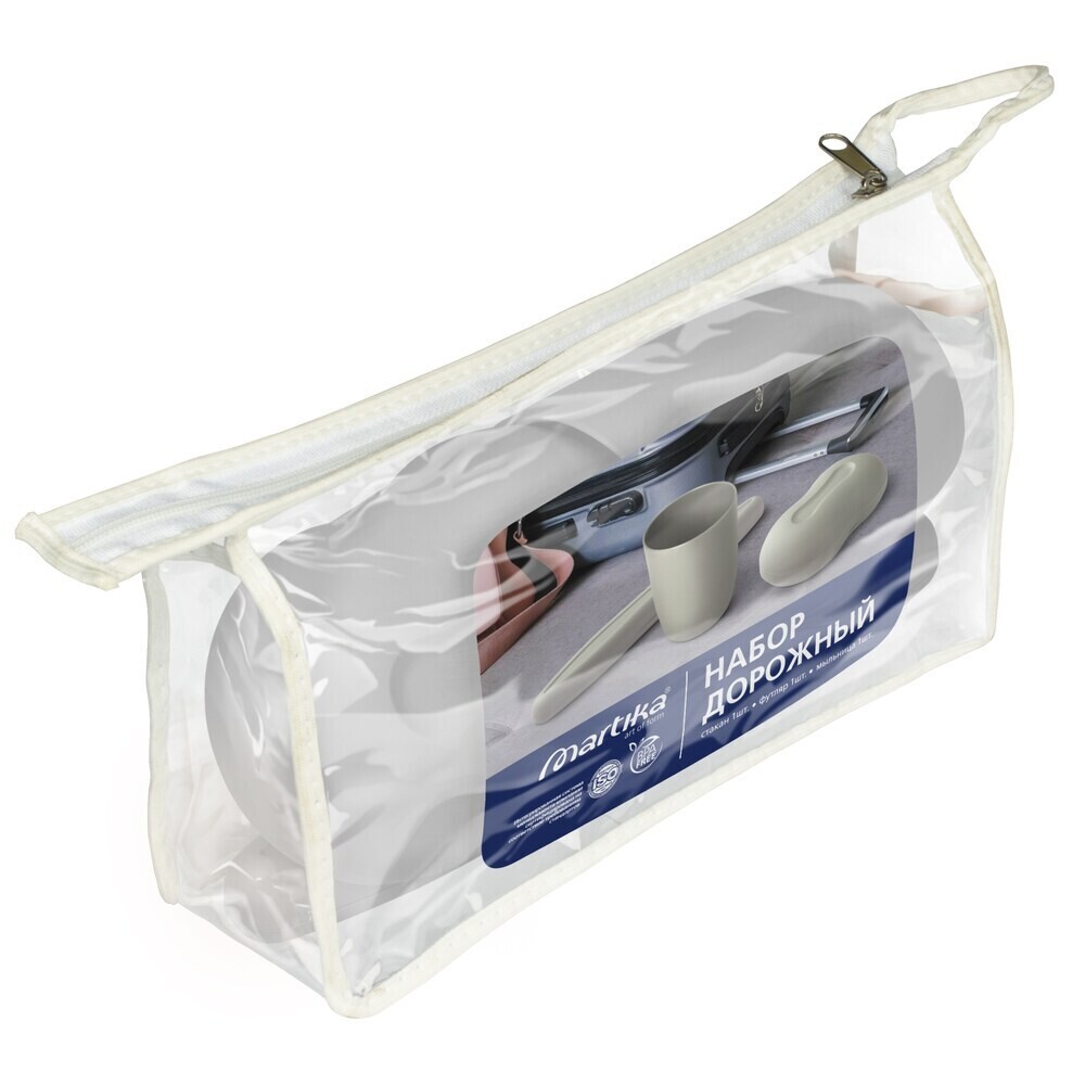Дорожный набор содержит самые необходимые аксессуары для личной гигиены, который удобно взять в поездку – герметично закрывающаяся мыльница, универсальный футляр для зубной щетки, непрозрачный пластиковый стаканчик. Набор упакован в прозрачную косметичку с замком, что позволяет перевозить предметы гигиены, не опасаясь попадания загрязнений от мыла и зубной пасты на прочие предметы багажа.