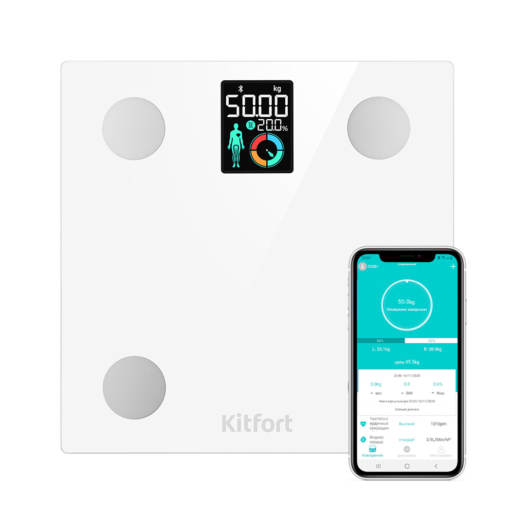 Модель КТ-838 представляет поколение умных весов, т.к. их можно подключить к приложению и анализировать параметры тела. Весы можно подключить к приложению Feelfit, включив передачу данных через Bluetooth. Приложение выводит на экран телефона разные параметры биоимпедансного анализа: индекс массы тела, мышечную массу, процентное содержание воды и жира в Весы оснащены жидкокристаллическим дисплеем с крупными цифрами, что делает их использование максимально удобным. Устройство выполнено из закаленного стекла, которое выдерживает массу до 180 кг. Прорезиненные ножки обеспечивают весам дополнительную устойчивость и предотвращают их скольжение по полу, что гарантирует безопасность во время взвешивания. На обратной стороне устройства находится разъем для батареек. Низкое энергопотребление обеспечивает бесперебойную работу устройства от одного комплекта из трех батареек типоразмера AAA. Включение и выключение весов происходит автоматически.