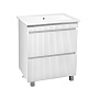 Тумба под раковину Модена (напольная) – это изысканность и утончённая роскошь в интерьере. Волнистые рифленые фасады визуально «оживляют» и «приводят в движение» всю обстановку комнаты, сохраняя при этом умиротворение и покой, превосходно сочетаются с классическим белым цветом корпуса. Цвет фасада также классический – белый глянец, идеально впишется в любой интерьер ванной комнаты. Тумба для ванной оснащена двумя выдвижными ящиками на направляющих скрытого монтажа, к тумбе для ванной подходит накладная керамическая раковина «Оскар» (770х470 мм).