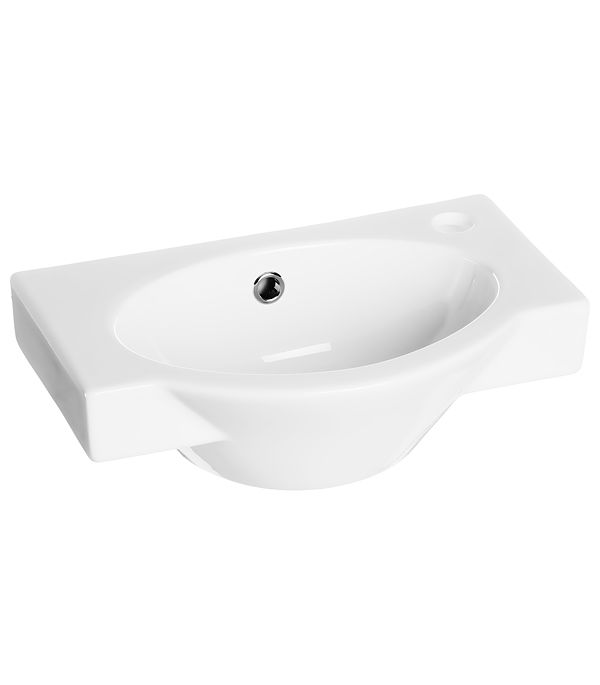 Мини раковина с отверстием под смеситель справа. Для данной раковины допустимы предельные отклонения габаритных и других размеров более 50 мм в пределах от +2,5 до -3 %.
