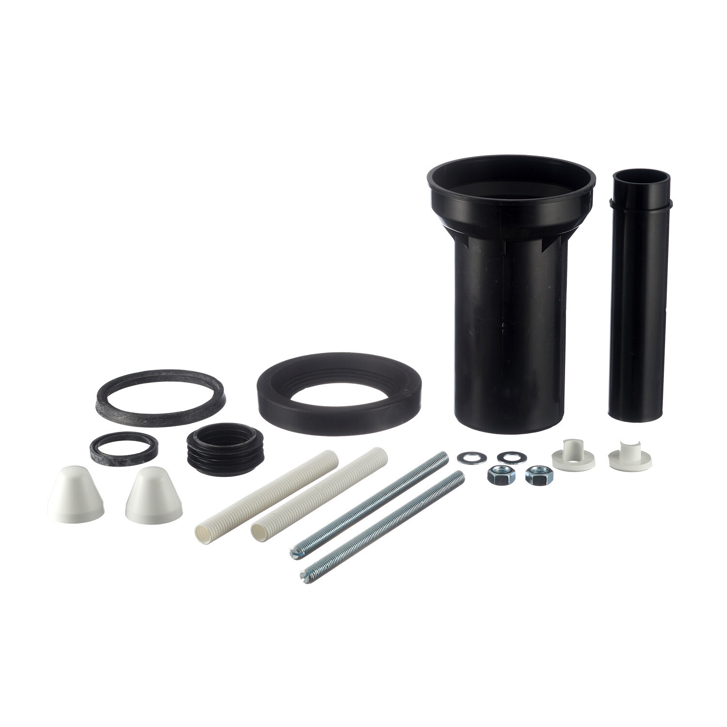 Патрубок сливной с прокладками, соединительный патрубок с прокладками и манжетой, монтажный комплект для крепления унитаза – шпилька М12 – 2 шт., шайба – 4 шт., колпачок – 2 шт., гайка – 2 шт., гофрированный рукав – 2 шт.